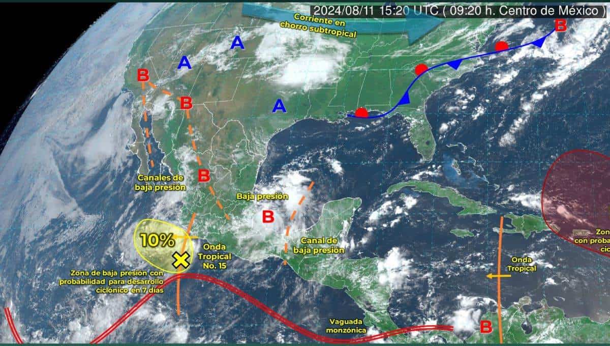 El monzón mexicano en combinación con divergencia en niveles altos de la atmósfera, ocasionará probabilidad de lluvias fuertes a muy fuertes acompañadas de descargas eléctricas y posible caída de granizo, además de rachas fuertes de viento con posibles tolvaneras en el noroeste del país, así como chubascos en la península de Baja California.