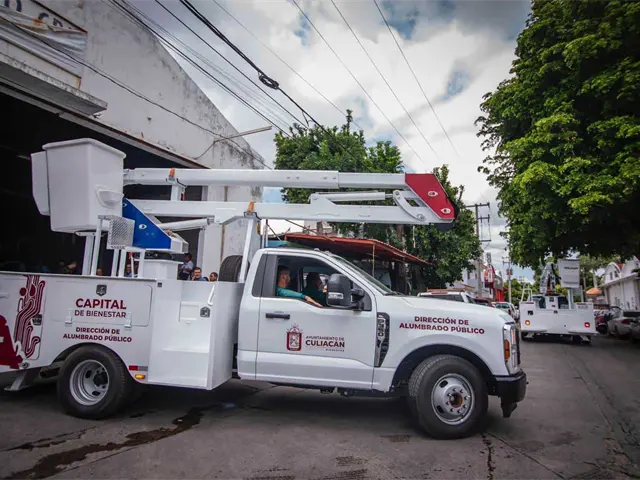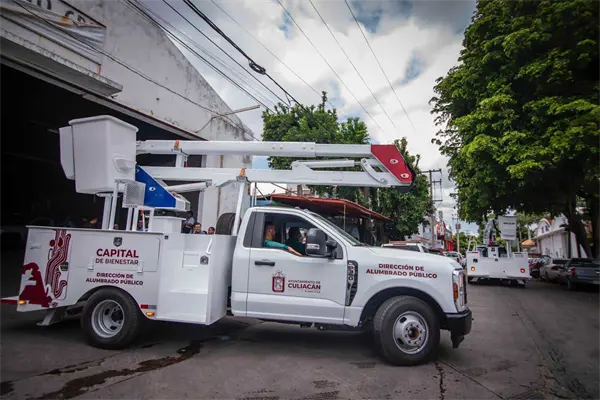El alcalde de Culiacán, Juan de Dios Gámez Mendívil, hizo entrega de cuatro grúas que se utilizarán para reforzar la atención de reportes de la Dirección de Alumbrado Público y Eficiencia Energética del Ayuntamiento.