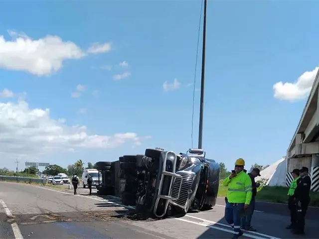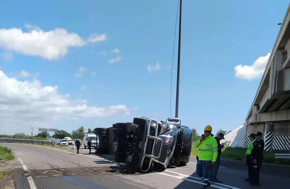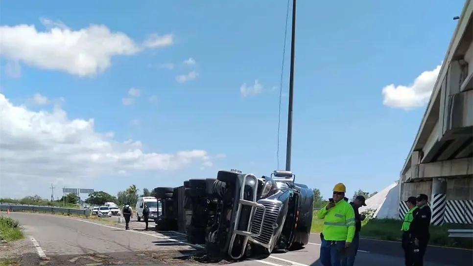 Una de las versiones es que el conductor del tractocamión tomó muy rápido la curva y debido al peso de la carga terminó accidentado.