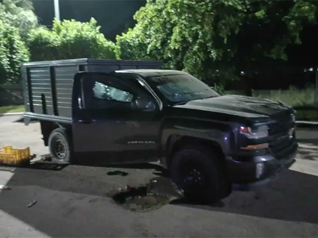 Uno de los neumáticos de la camioneta Chevrolet negra está reventado por los disparos y las ventanas también están dañadas por los impactos de bala.