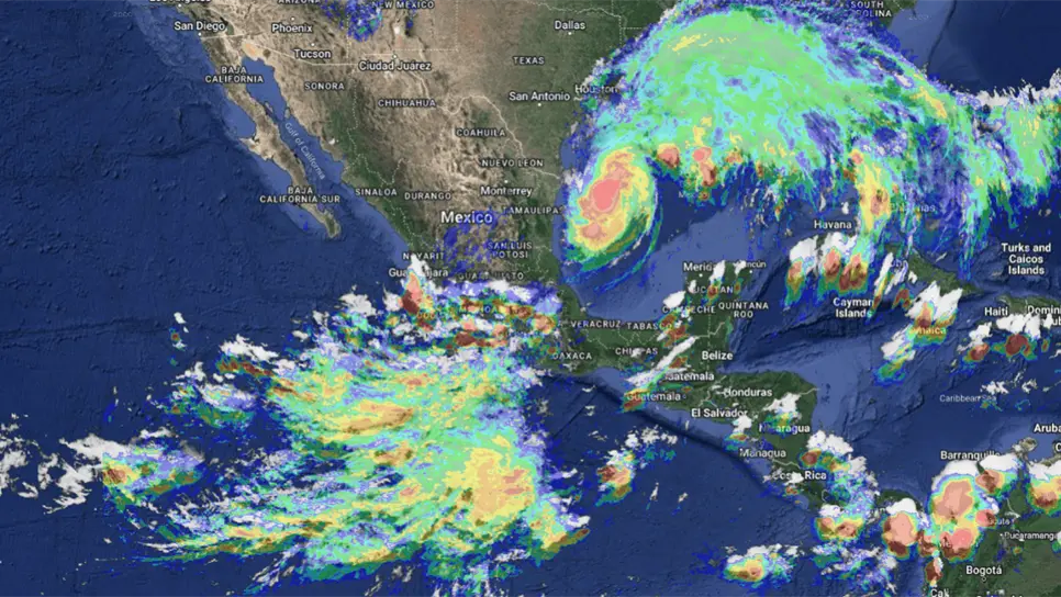 Simultáneamente, el ingreso de humedad del Océano Pacífico, Golfo de México y Mar Caribe propiciará chubascos y lluvias fuertes a puntuales muy fuertes en el noreste, centro, oriente y sureste del país, además de la Península de Yucatán.