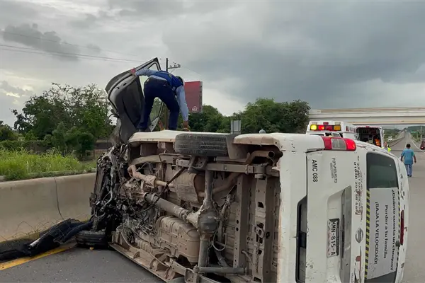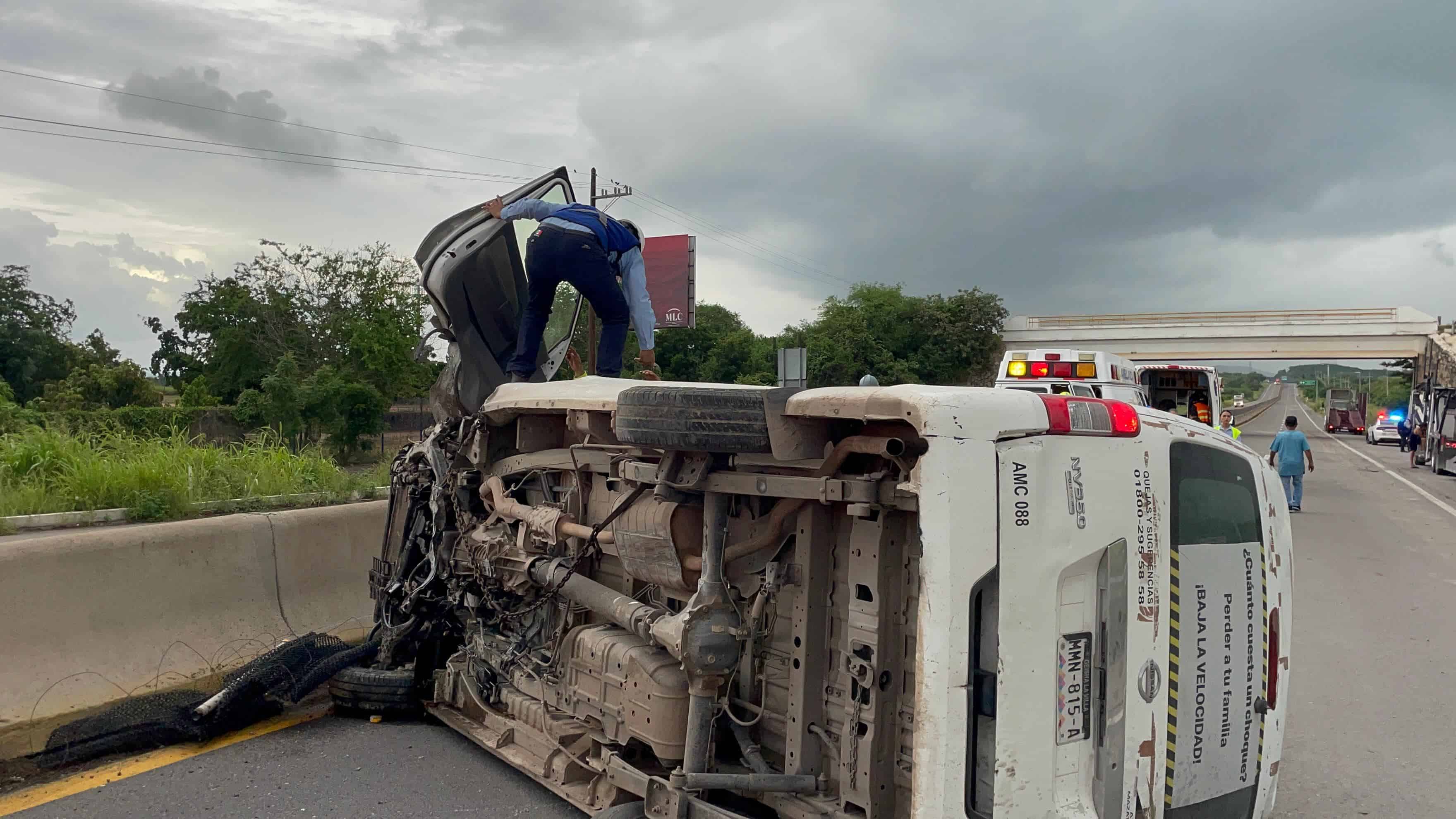 Una camioneta tipo van que trasladaba a personal de la caseta de cobro de Mármol sufrió un accidente tipo choque con volcadura cuando circulaba por el kilómetro 10 de la autopista Mazatlán-Culiacán.