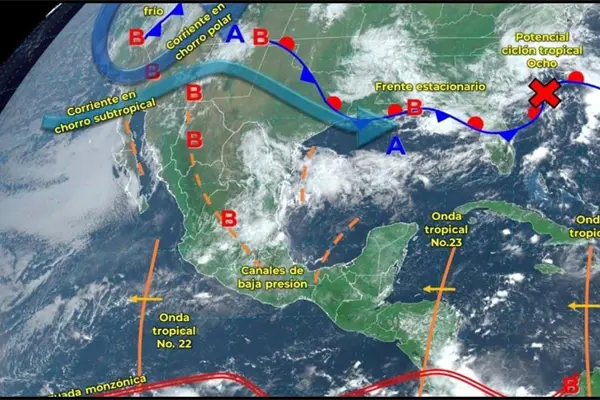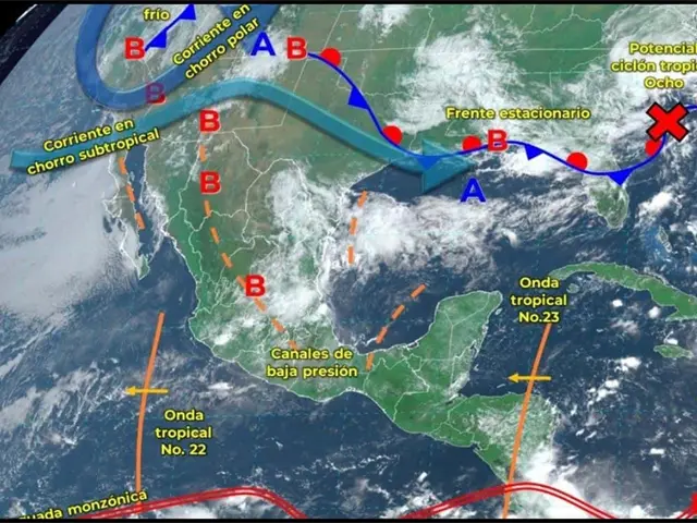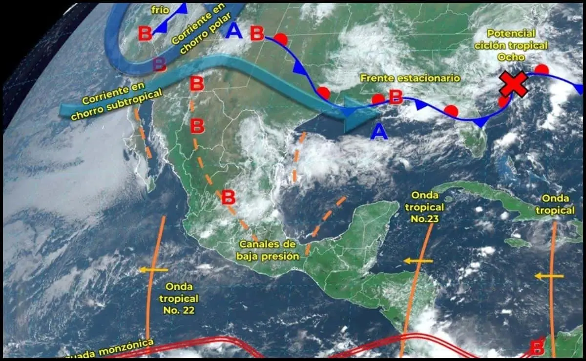 Por si fuera poco, habrá lluvias fuertes a muy fuertes con descargas eléctricas, rachas de viento y posibles granizadas en el norte, occidente, centro y oriente de México debido a un centro de baja presión y el desplazamiento de la onda tropical 22.