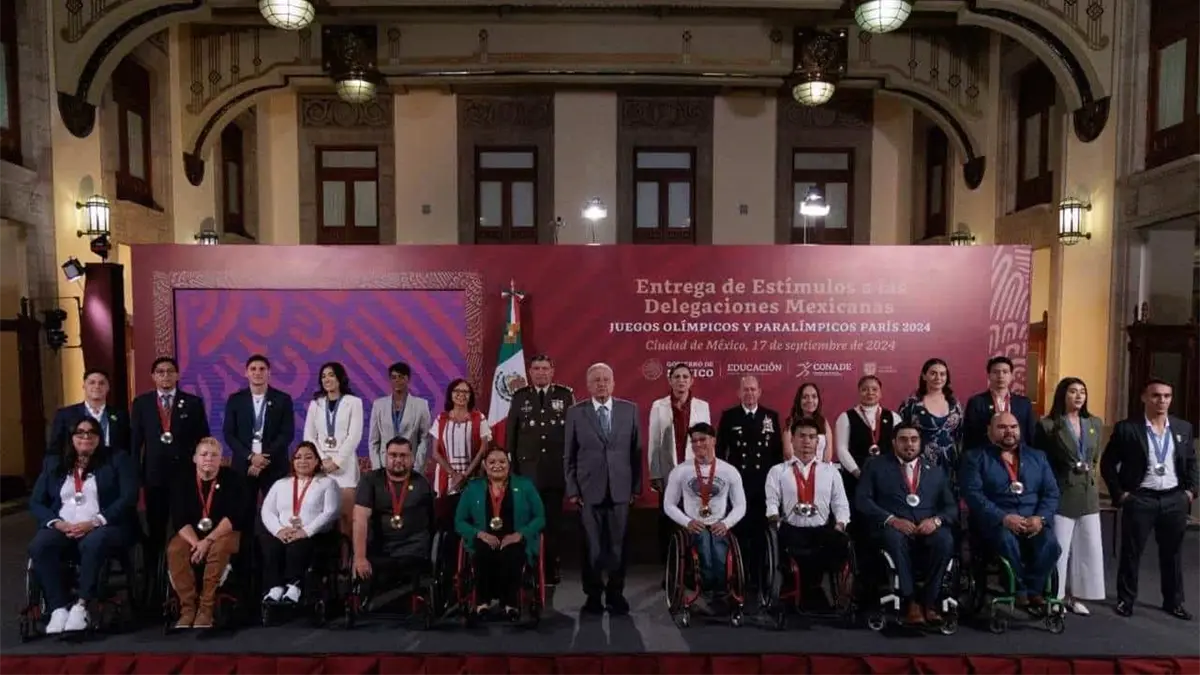 "En Palacio Nacional, inicia la ceremonia de Entrega de Estímulos a los integrantes de las delegaciones mexicanas de los Juegos Olímpicos y Paralímpicos #Paris2024, encabezada por el presidente Andrés Manuel López Obrador y Ana Gabriela Guevara, titular de la CONADE": publicaron