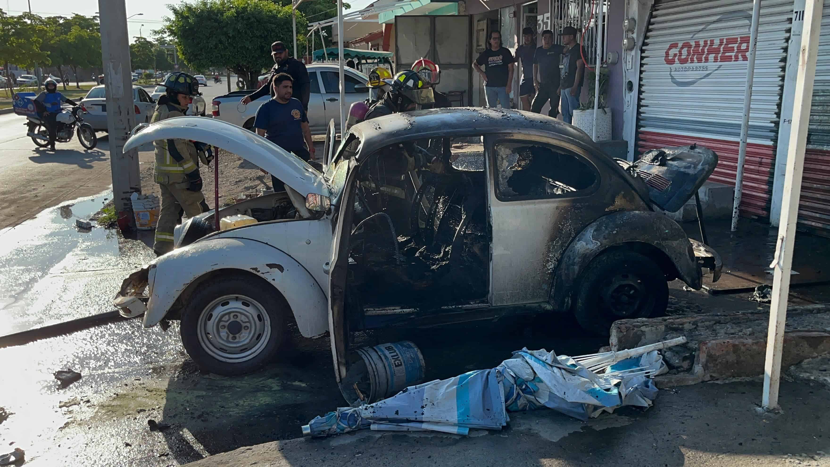 Tras el reporte a los números de emergencia, elementos de Bomberos Veteranos y Bomberos Voluntarios de Mazatlán se hicieron presentes para sofocar el fuego en el vehículo de 4 llantas.
