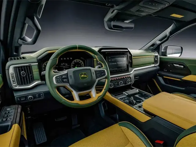 Sin duda, el interior de la nueva camioneta John Deere 2025 es algo que ha despertado el interés de muchos, y es que está pick up tendría un espacio cómodo y amplio, con asientos cómodos de cuero y una tecnología de última generación, con un tablero con pantalla táctil de 12 pulgadas, la cual ofrecerá la opción de conectar Apple carplay y Android auto.