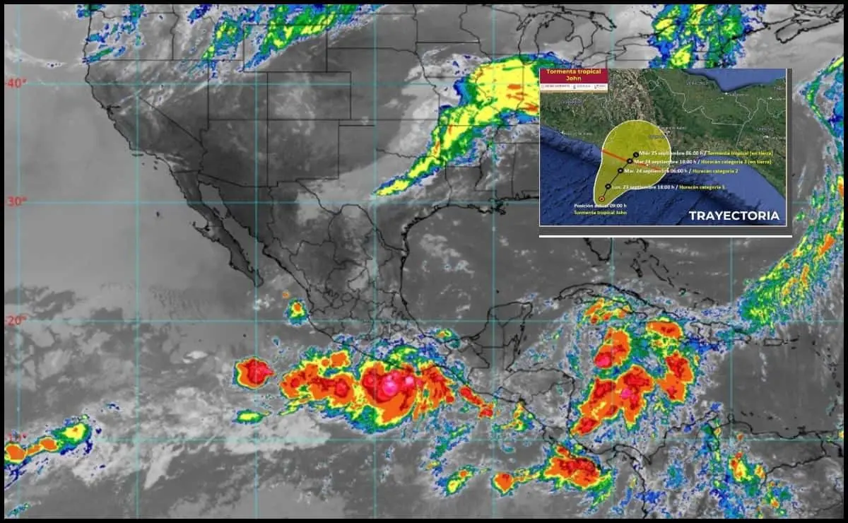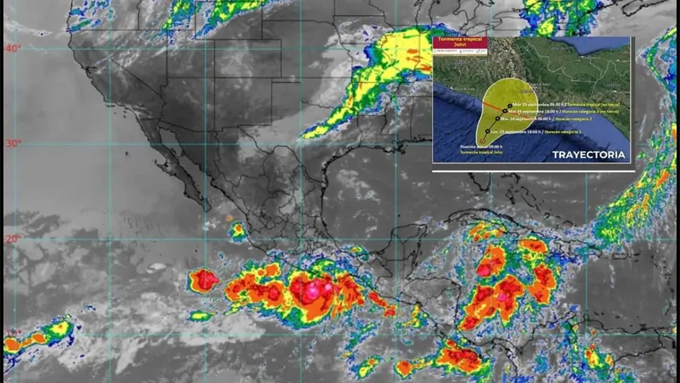 Horas más tarde, el lunes 23 de septiembre, el SMN actualizó el reporte, detallando la formación de la Tormenta Tropical John, la cual tendrá efectos en diversos estados, como lluvias fuertes, rachas de viento y olas de hasta 6 metros de altitud.