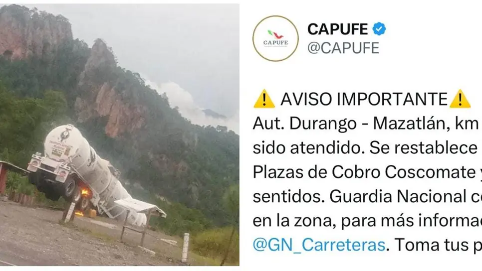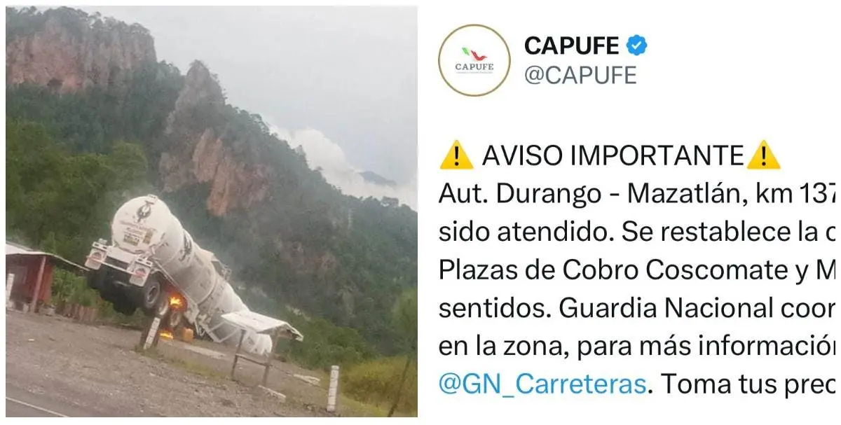 Por la atención de este accidente, personal de Caminos y Puentes Federales, Capufe, realizó el cierre a la circulación de vehículos, desde la caseta de cobro de Mesillas en el municipio de Concordia, hasta la de Coscomate, ya en el estado de Durango.