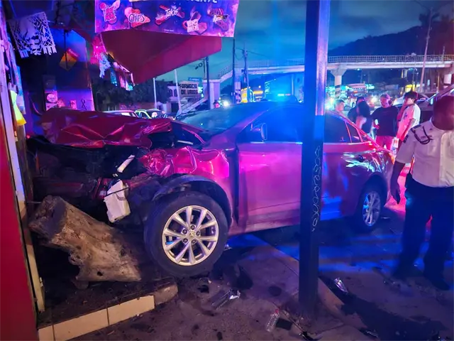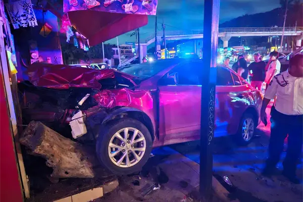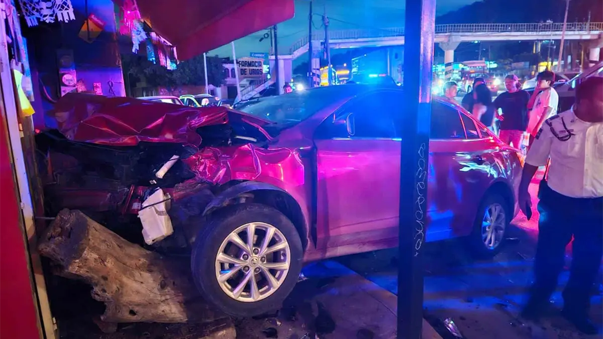 El percance ocurrió luego de que uno de los conductores aparentemente invadió carril y provocó el choque contra la otra unidad particular, que tras el impacto, el automóvil de color rojo, terminó en la fachada de un comercio de frutería.
