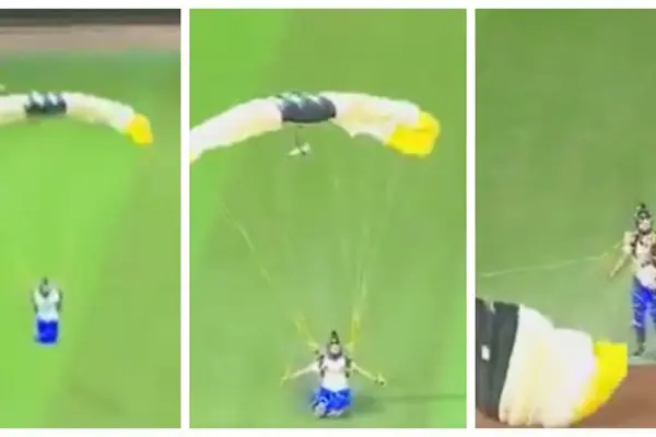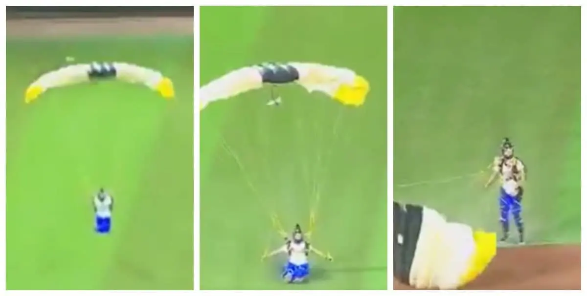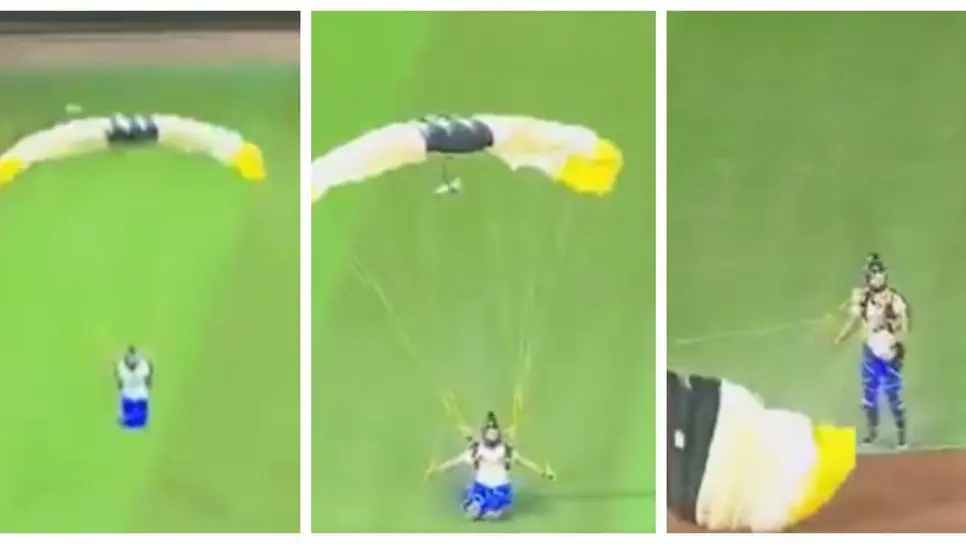 Sin embargo, lo chusco no llegaría sino horas después, en la parte baja de la tercera entrada, cuando dos jóvenes paracaidistas cayeron al terreno de juego, pausando el encuentro por unos momentos.