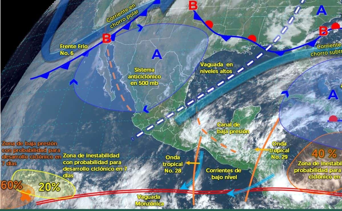 - Viento fuerte: Yucatán, Quintana Roo (40 a 60 km/h) y tolvaneras en el norte.