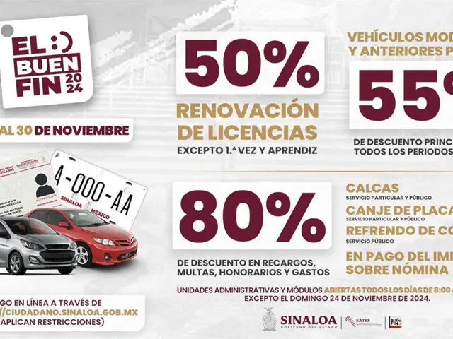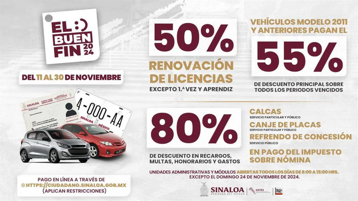 El Gobierno de Sinaloa ofrecerá descuentos por el Buen Fin en multas, honorarios y trámites vehiculares, disponibles del 11 al 30 de noviembre.