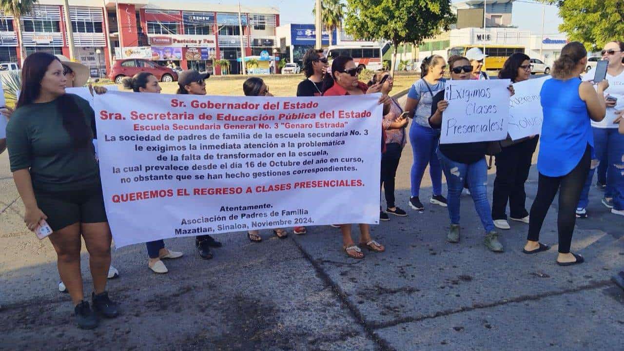 Los padres de familia de la secundaria Federal 3 en Mazatlán se manifestaron para exigir la instalación de un transformador y poder reanudar clases tras un mes sin electricidad