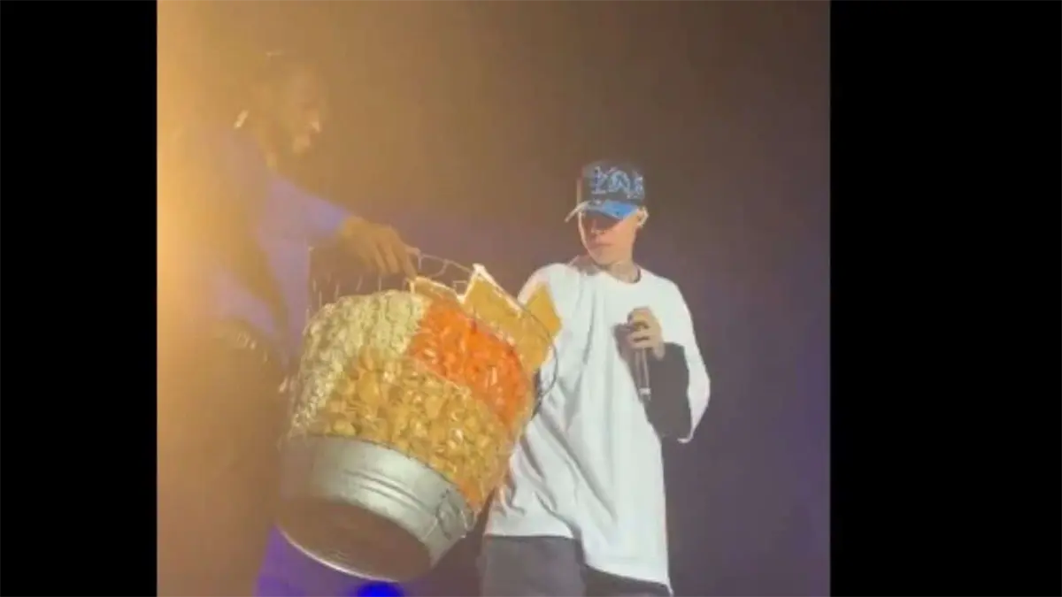 La enorme canasta que contenía el producto la subieron al escenario, donde el rapero las repartió entre los asistentes.