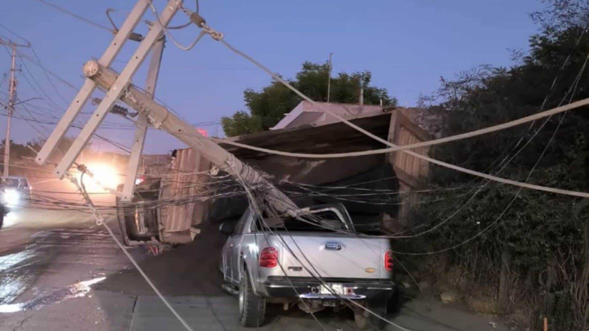 Vuelca chofer de góndola y derriba un poste de energía eléctrica al sur de Culiacán