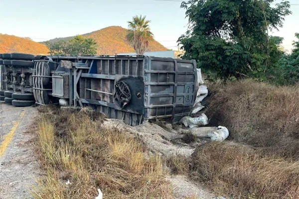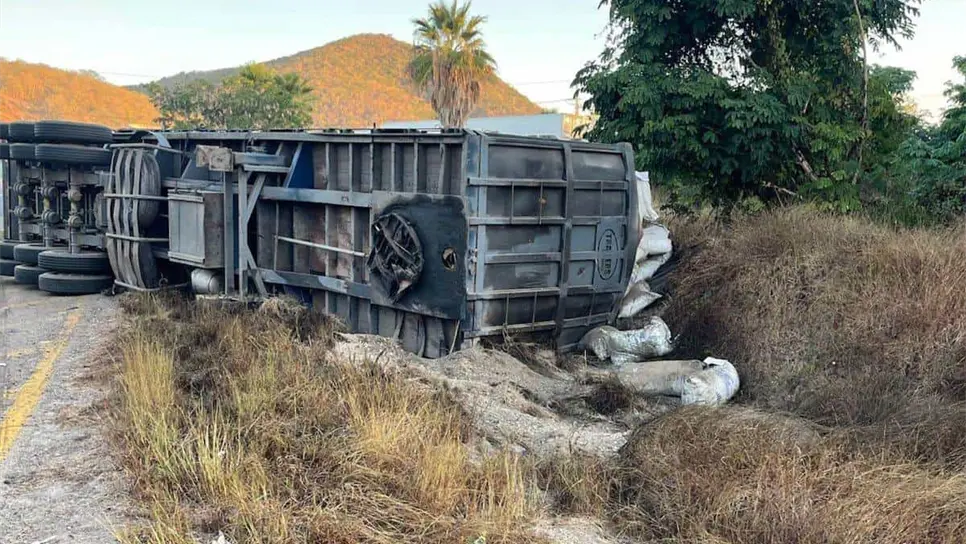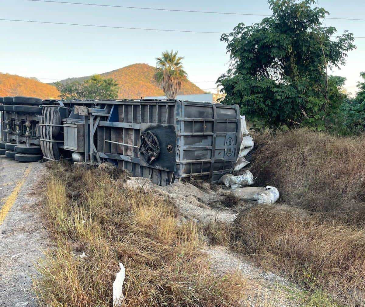De acuerdo a la información por parte de la Guardia Nacional, el tractocamión de color blanco jalaba un remolque cargado con sacos de harina de pescado, procedente de la ciudad de Culiacán, con destino a este puerto, cuando por el peso y la velocidad, lo hicieron que volcara en una curva.
