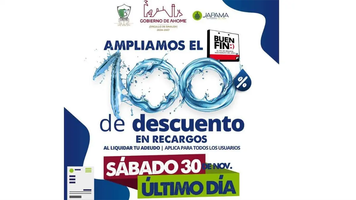 La Junta de Agua Potable y Alcantarillado del Municipio de Ahome (Japama) todavía tiene activos los descuentos del Buen Fin, hasta el sábado 30 de noviembre, por lo que los usuarios domésticos, comerciales e industriales están a tiempo de dejar su cuenta en ceros sin pagar ningún recargo.