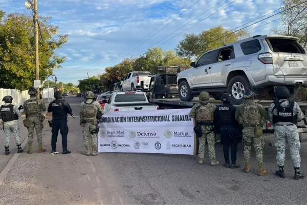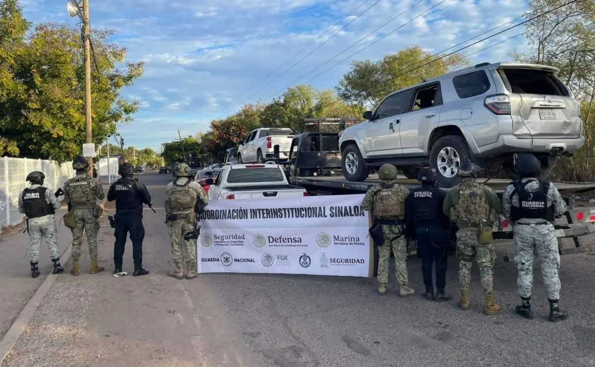 La Defensa Nacional, con el apoyo de la Guardia Nacional, la Secretaría de Marina, la Fiscalía General de la República, la Fiscalía General del Estado y la Secretaría de Seguridad Pública de Sinaloa, a través de la Policía Estatal Preventiva, señalo que se aseguró vehículos, armas y municiones en Navolato.