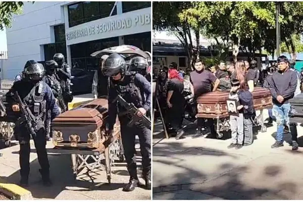 Tras la llegada de la carroza, los compañeros policías procedieron a bajar los ataúdes para llevar a cabo el homenaje.