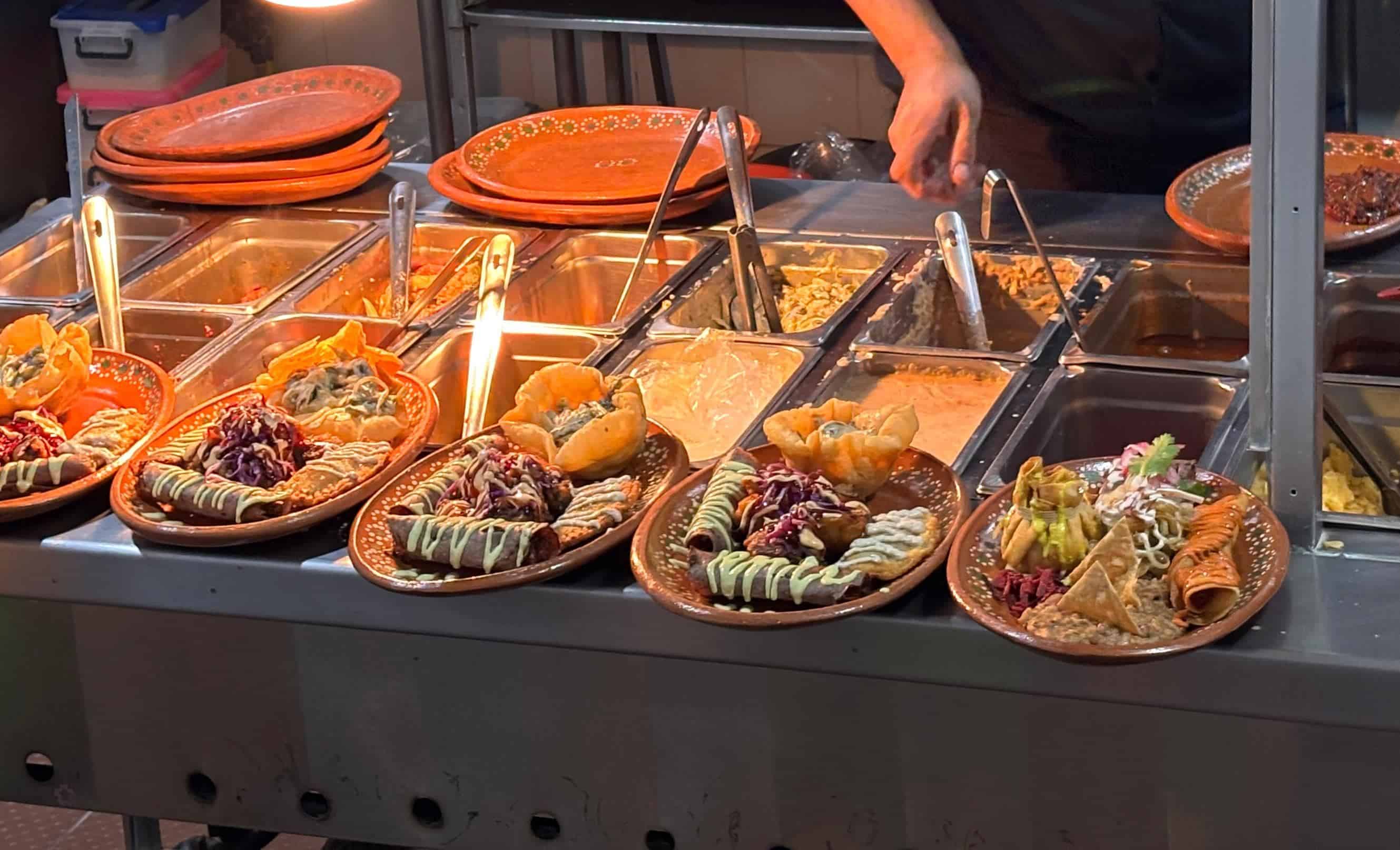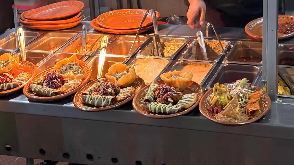Chimichanga rellena de Chicharrón sobre salsa maldita verde, Taco Paseado de Chorizo con crema de ajo, flauta de harina rellena de Chilorio con aderezo de cacahuate enchilado y frijoles refritos con asientos de puerco y un toque picante.