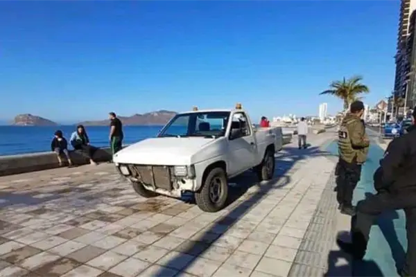 Camioneta sufre falla en frenos y termina sobre la banqueta del malecón de Mazatlán