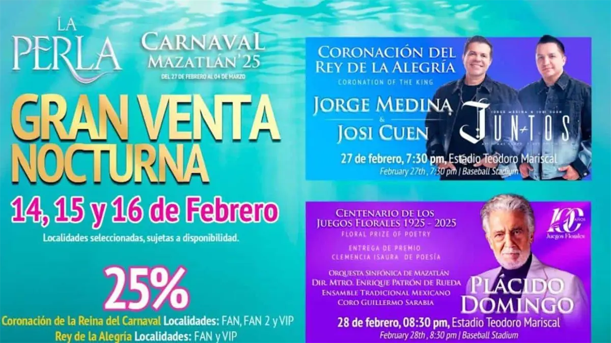 El Instituto Municipal de Cultura, Turismo y Arte de Mazatlán dio a conocer la Gran Venta Nocturna, una oportunidad única para adquirir boletos con descuentos especiales para las coronaciones del Carnaval Internacional de Mazatlán 2025 "La Perla", que se llevará a cabo del 27 de febrero al 4 de marzo.