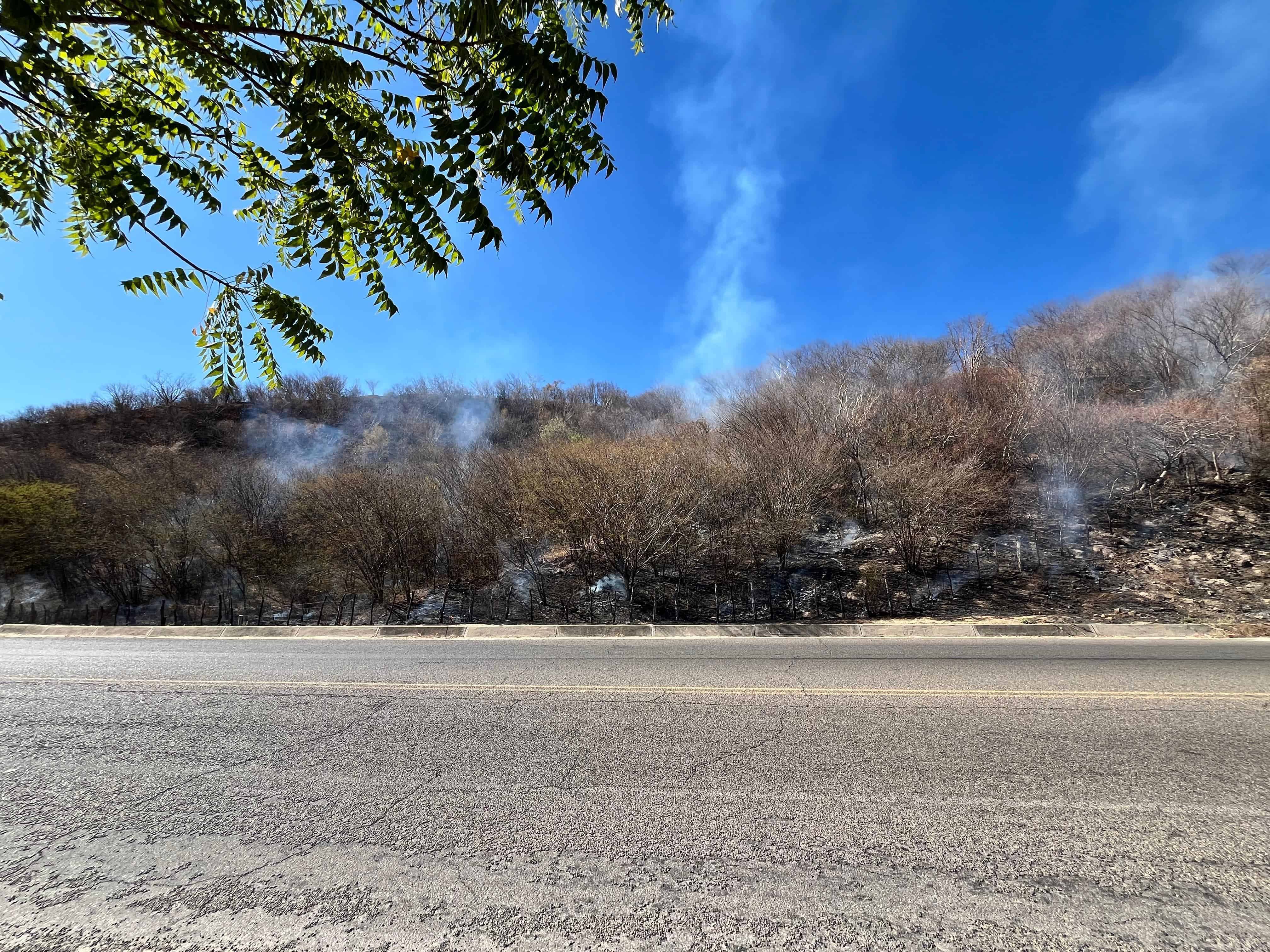 El incendio se originó al pide un cerro y a un costado de la carretera estatal que comunica de El Fuerte a Choix, escasos metros antes de llegar a la gasolinera de la entrada principal del alteño municipio.
