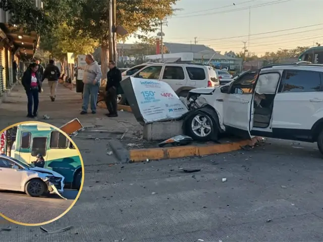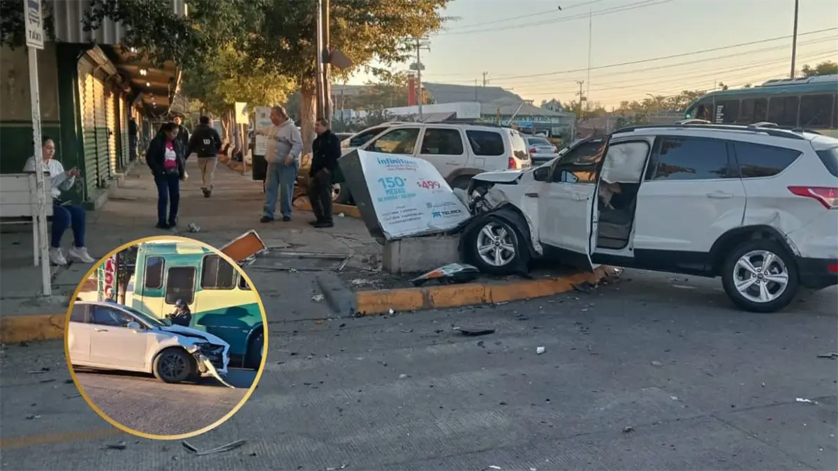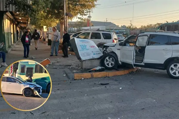 Con el impacto, el vehículo giró y quedó sobre la calle Marcial Ordóñez junto a un autobús, frente a la entrada de la central camionera. Mientras que la vagoneta se montó en la banqueta de la esquina y se impactó contra una caja del centro de control de una empresa de telefonía fija.