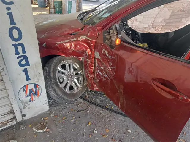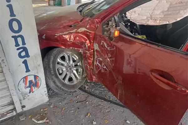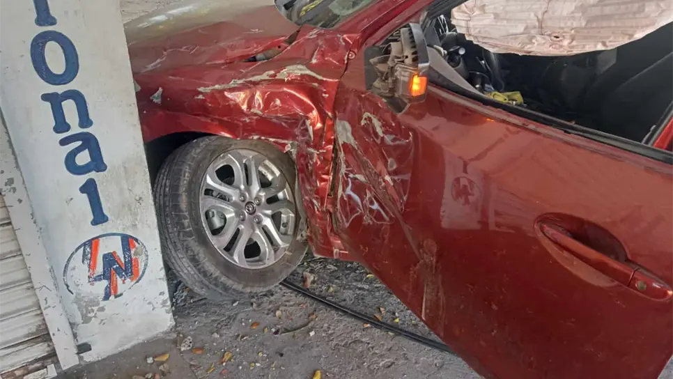 Un aparatoso accidente registrado en un transitado crucero de la ciudad de Los Mochis dejó como saldo a dos personas lesionadas, además de cuantiosas pérdidas en daños materiales en ambos vehículos y en la fachada de un negocio de venta de cachitos de lotería.