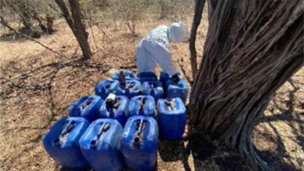 Durante trabajos de reconocimiento en los municipios de Culiacán y Cosalá, personal militar localizó asentamientos utilizados para la fabricación de drogas sintéticas, con diversas sustancias químicas, mezcladoras, reactores, bidones, tambos, barriles, costales, condensadores, centrifugadores, entre otros.