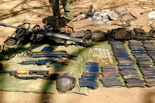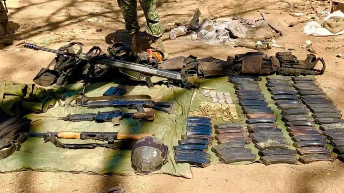Durante reconocimientos terrestres en las inmediaciones de dicha localidad, personal militar llevó a cabo la localización y aseguramiento de un fusil Barrett, 2 AK-47 conocidas como “Cuerno de Chivo”, además de 1 AR-15 y 7 artefactos explosivos improvisados.