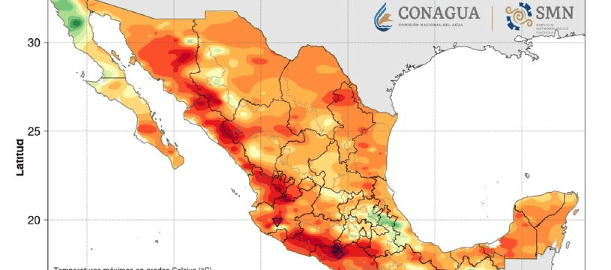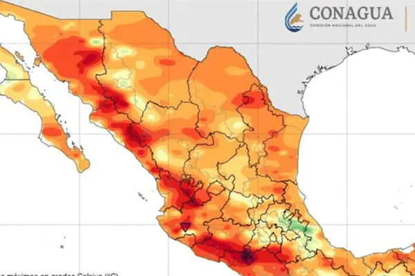 - Temperaturas máximas 40 a 45 °C: Sonora (sur), Sinaloa, Michoacán, Guerrero, Morelos, Oaxaca y Chiapas.