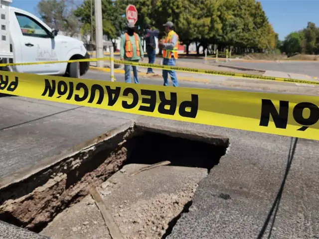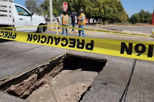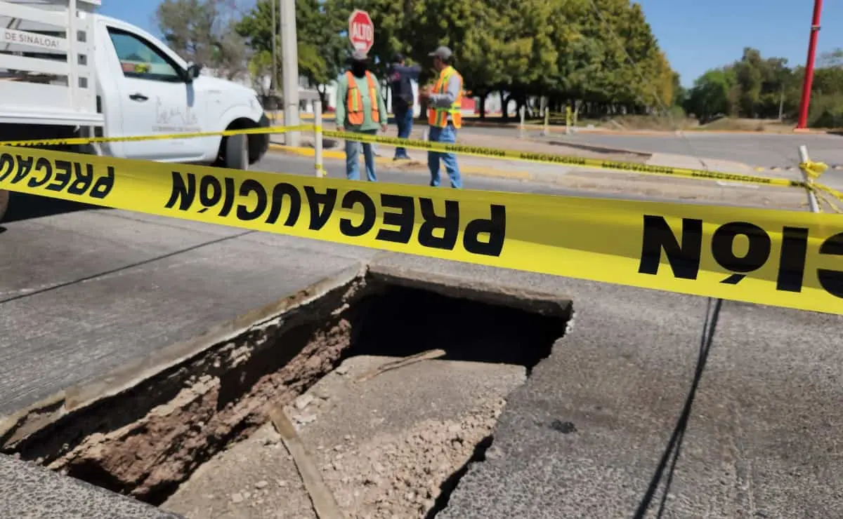 Un enorme socavón apareció en el cruce de los bulevares Pedro Anaya y Antonio Rosales, en la ciudad de Los Mochis, debido al desprendimiento total de una loza de concreto.