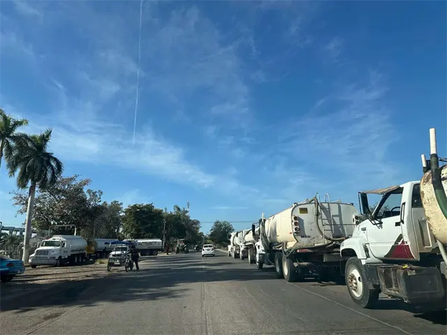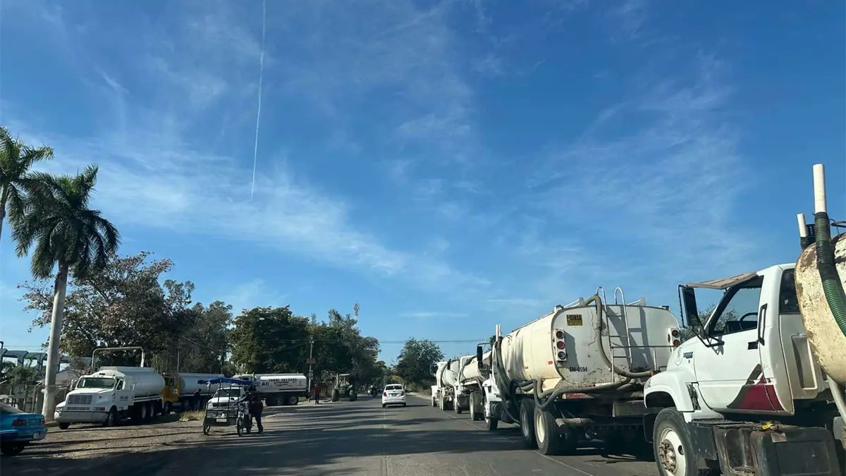 Decenas de pipas hacen fila afuera de la planta potabilizadora José Hernández Terán para abastecerse de agua y llevarla a diferentes zonas del municipio, en medio de una crisis de sequía que mantiene en vilo a los habitantes de Ahome.