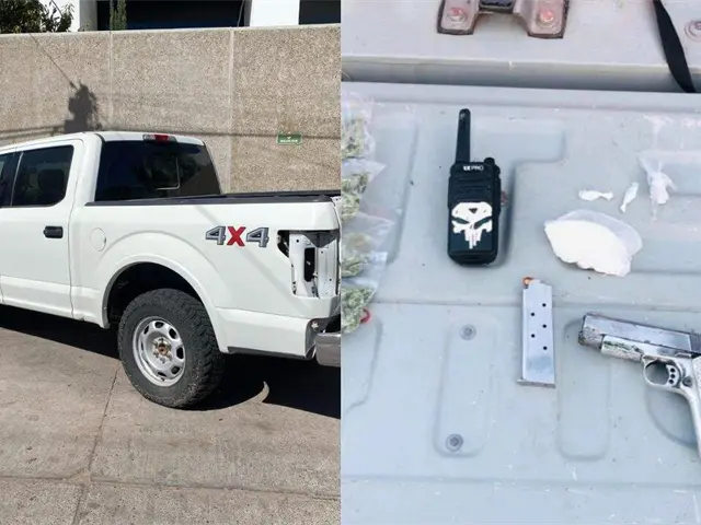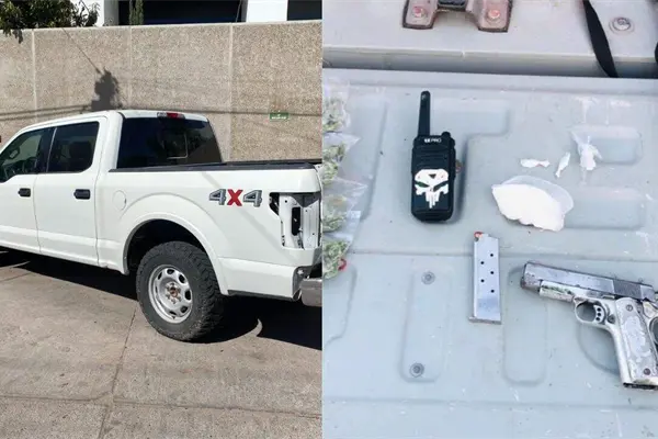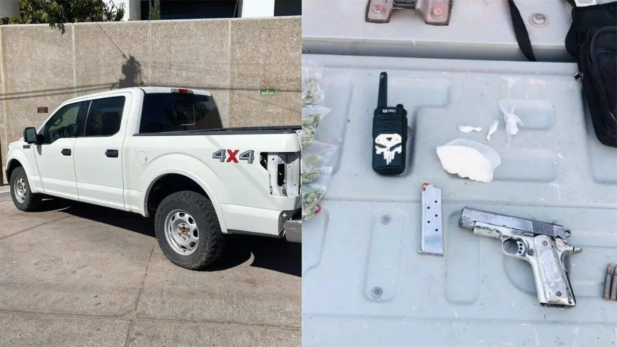Al abrir la camioneta para revisarla, localizaron una mochila de color negro, en la cual se encontraban 10 dosis de marihuana, un arma corta calibre .45 mm, así como un cargador y 19 cartuchos útiles para arma larga. No se especificó si eran calibre .223 para rifle R-15 o 7.62x39 mm para rifle AK-47, de los llamados “cuerno de chivo”. También incautaron un radio de comunicación.