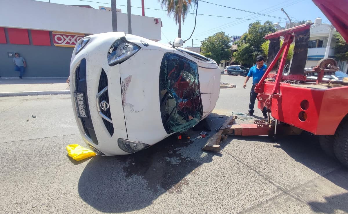 Conductor de un vehículo se pasa un alto y termina volcado cerca del centro de Los Mochis