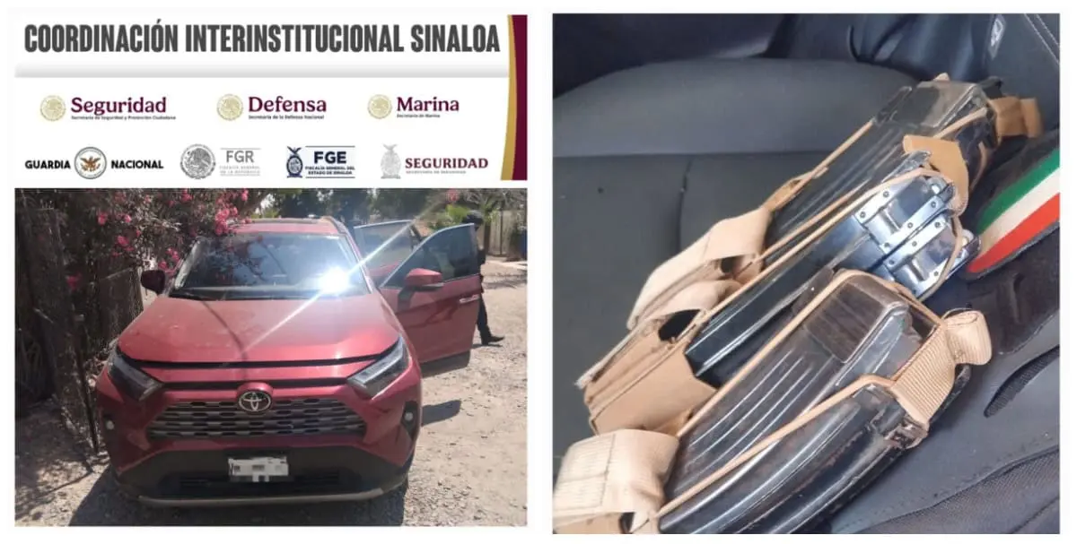 Elementos del grupo interinstitucional aseguraron un vehículo con reporte de robo reciente y, en su interior, cargadores, cartuchos y equipo táctico en la sindicatura de Villa Juárez, Navolato.