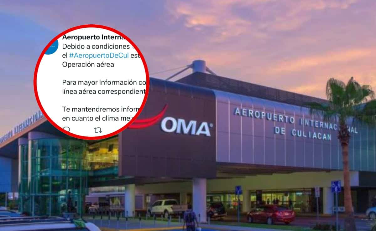 "Debido a condiciones climáticas, el Aeropuerto de Culiacán está cerrado a la Operación aérea. Para mayor información comunícate con la línea aérea correspondiente. Te mantendremos informado de la reapertura, en cuanto el clima mejore".