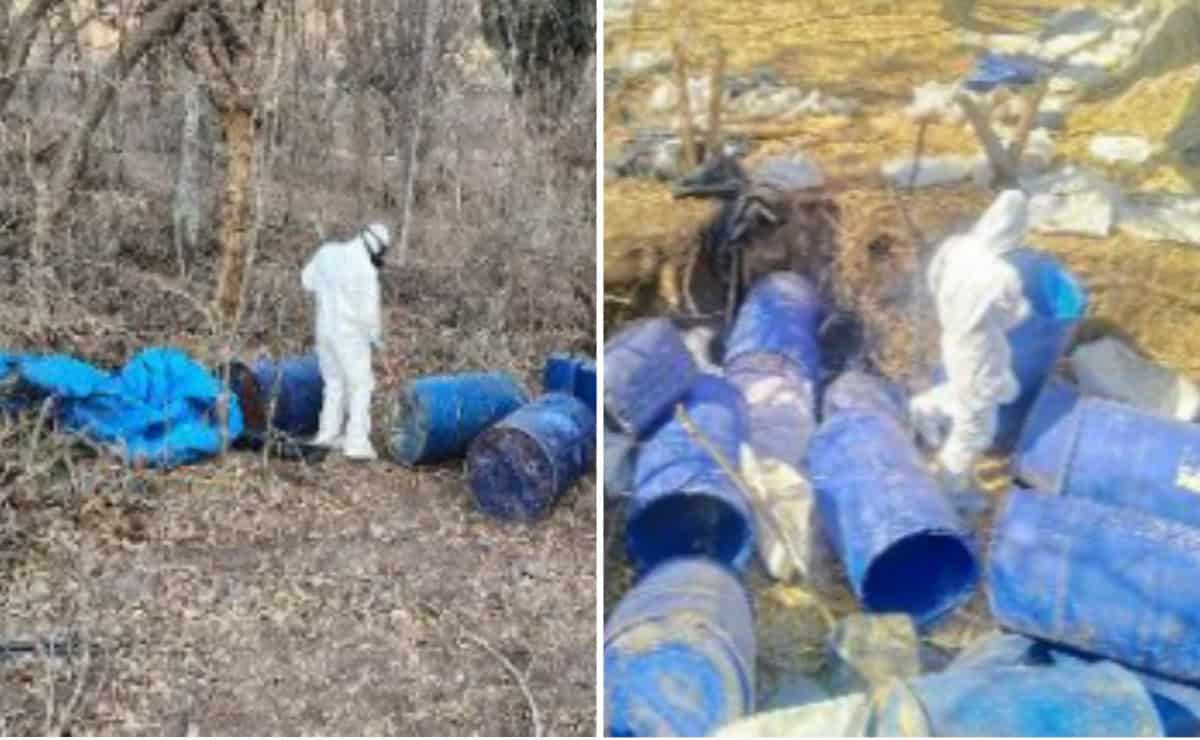 Durante acciones de reconocimiento terrestre en los municipios mencionados, el personal militar localizó asentamientos utilizados para la fabricación de drogas sintéticas, junto con diversas sustancias químicas, además de bidones, tambos, costales, tinas y otros utensilios.