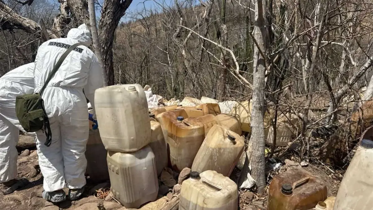 En el sitio se aseguraron alrededor de 5 mil 800 litros de precursores líquidos y 25 kilogramos de precursores sólidos, así como diversos accesorios y herramientas de trabajo, entre ellos tinas, tanques de gas LP, bombas de agua sumergibles, ollas y bidones de plástico.