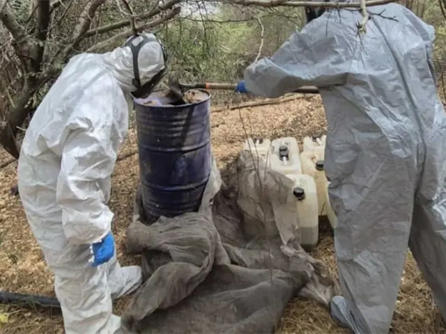 - 3 tambores con capacidad de 200 litros, conteniendo, presumiblemente, precursor químico, para un total aproximado de 600 litros.