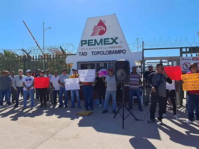 Trabajadores de Petróleos Mexicanos (Pemex), activos y jubilados, se manifiestan pacíficamente frente a las instalaciones de la paraestatal en Topolobampo para manifestar su inconformidad porque tienen cuatro meses sin servicios médicos.