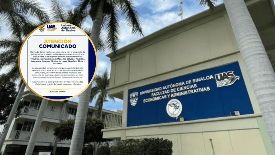 La Universidad Autónoma de Sinaloa (UAS) informó mediante un comunicado oficial en redes sociales que, como medida preventiva ante recientes hechos de violencia, las clases se impartirán de manera virtual este martes 6 de mayo en ocho municipios del estado: Mocorito, Salvador Alvarado, Angostura, Guasave, Sinaloa de Leyva, Navolato, Elota y Escuinapa.
