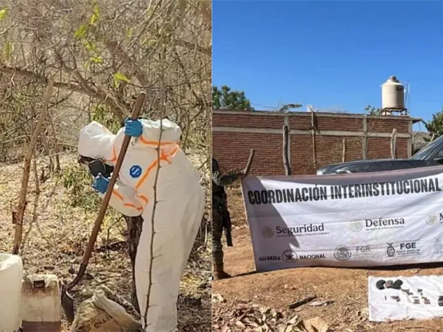 Además en el sitio se localizaron cuatro armas largas, 14 cargadores, un cargador de tambor, cuatro chalecos porta placas, ocho placas balísticas, así como aproximadamente 120 litros de metanfetamina líquida, lo equivalente a aproximadamente 400 mil dosis de cristal, 50 litros de fenilacetona, 25 kilogramos de manitol y 25 kilogramos de Hidróxido de Sodio.