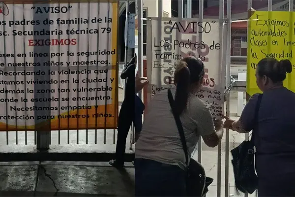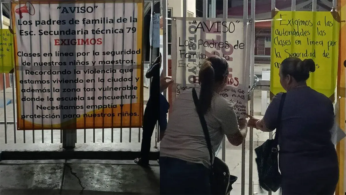 "Los padres de familia de la Esc. Secundaria técnica 79 EXIGIMOS clases en línea por la seguridad de nuestros niños y maestros. Recordando la violencia que estamos viviendo en la ciudad y además la zona tan vulnerable donde la escuela se encuentra", se podía leer en uno de los carteles.