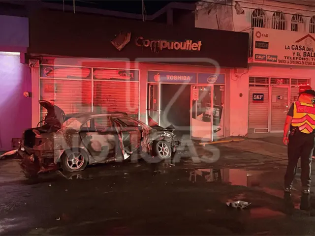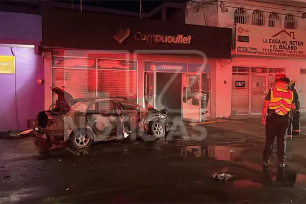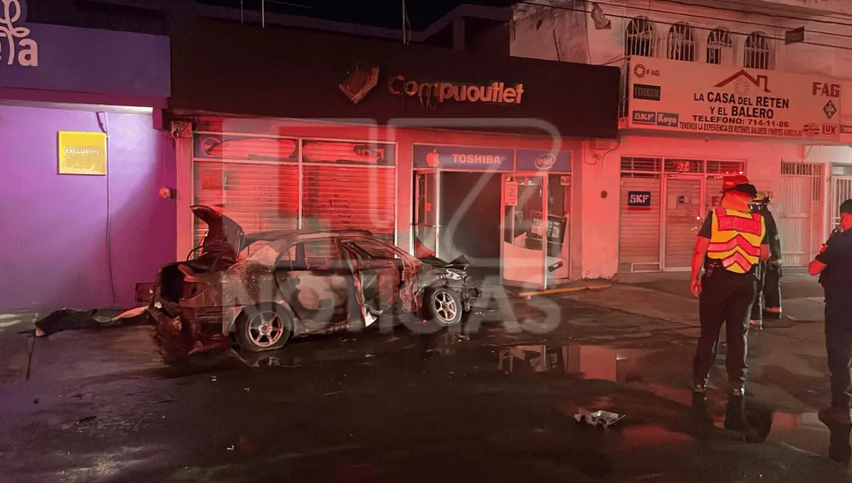 Una vez que detuvo su marcha, el sedán comenzó a incendiarse, y debido a las altas temperaturas los cristales del negocio se reventaron, además de que el humo ingresó al local, que resultó con grandes afectaciones.