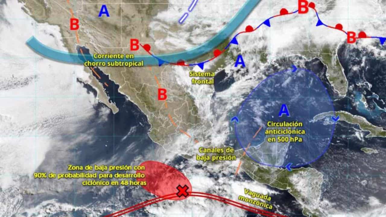 La Comisión Nacional del Agua (Conagua) y el Servicio Meteorológico Nacional (SMN) dieron a conocer que una zona de baja presión localizada al sur del estado de Guerrero, presentó un 100 porciento de probabilidad de desarrollo ciclónico en las próximas 48 horas como en siete días.