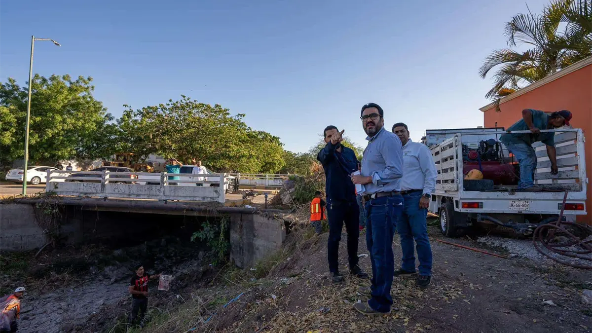 El alcalde Juan de Dios Gámez Mendívil realizó un recorrido de supervisión por el sector La Conquista, específicamente en el Dren Bacurimí, acompañado del titular de Protección Civil Municipal, Jesús Bill Mendoza Ontiveros, para constatar el avance de estas labores preventivas.