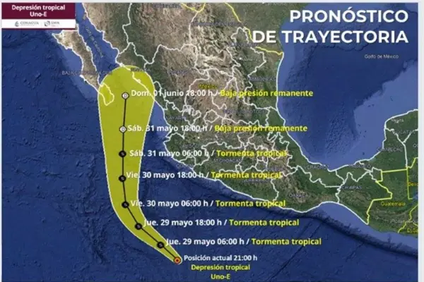 La depresión tropical Uno-E ha cambiado ligeramente su pronóstico de impacto, enfilándose ahora hacia el norte de Sinaloa, sin tocar tierra en Baja California Sur como se había pronosticado en el primer boletín de la Conagua.