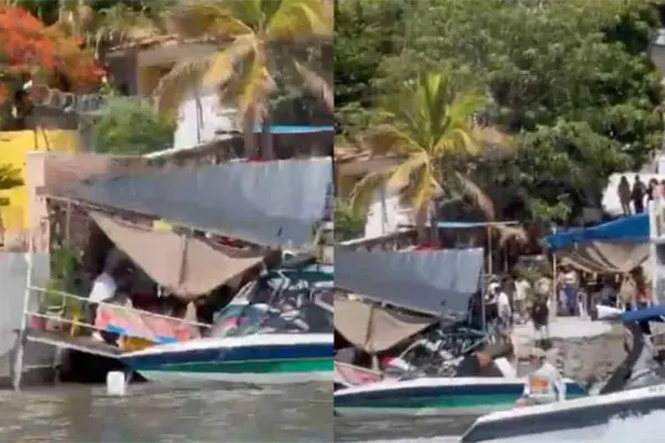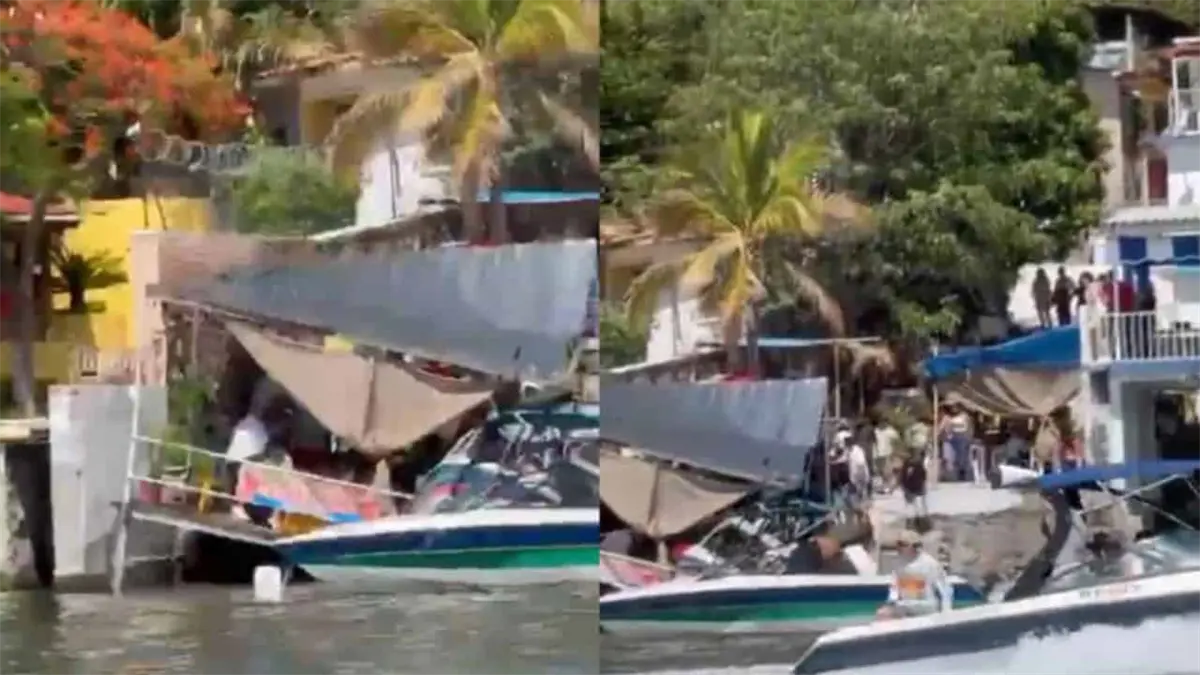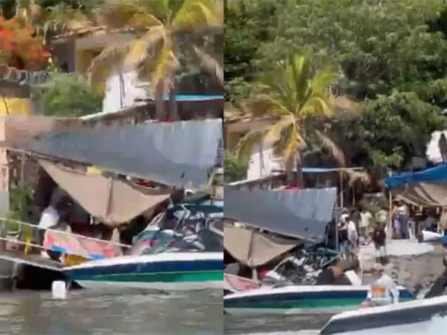 Testigos que estaban a bordo de embarcaciones siguiendo el evento acuático, grabaron el momento donde el muelle colapsó al escucharse un fuerte ruido donde este no soportó el peso de las personas.